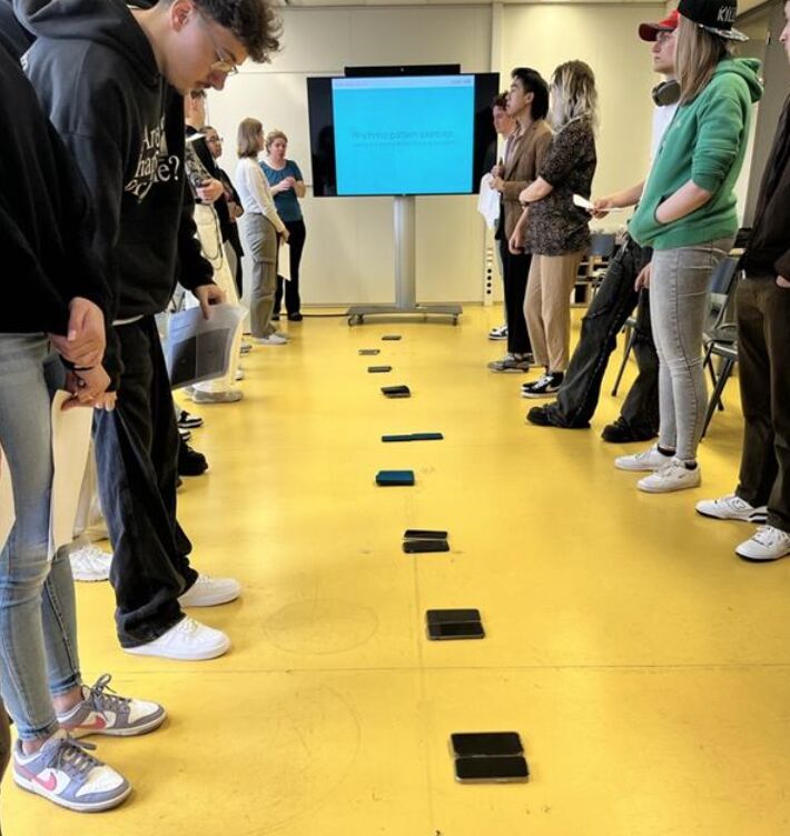 Students had to walk to the beat, towards their phones and back, eyes closed - eyes open, reflecting. And two steps forward, 5 steps back, legato - staccato, reflecting. 20 steps, back and forth, and playing with a texting support duet for navigating the interface with the eyes closed.